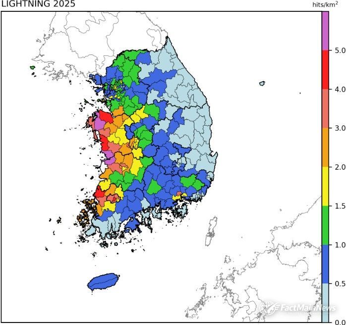 팩트메인뉴스 이훈 기자 | 기상청은 2025년 우리나라에서 관측된 낙뢰 정보를 담은 ‘2025 낙뢰연보’를 발간했다. 연보는 기상청 21개 낙뢰 관측망으로 관측한 자료를 통해 분석한 △월별, 광역시·도별, 시군구별 낙뢰 횟수 △단위 면적당(㎢) 횟수 △낙뢰 공간 분포 △주요 5대 낙뢰 사례 등의 내용을 담고 있다.