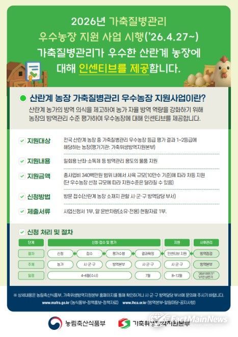 팩트메인뉴스 이훈 기자 | 농림축산식품부는 축산농가의 방역역량을 강화하고 가축전염병 발생을 사전 예방하기 위해 '가축질병관리 우수농장 지원사업'을 2026년 4월부터 본격 추진한다고 밝혔다.