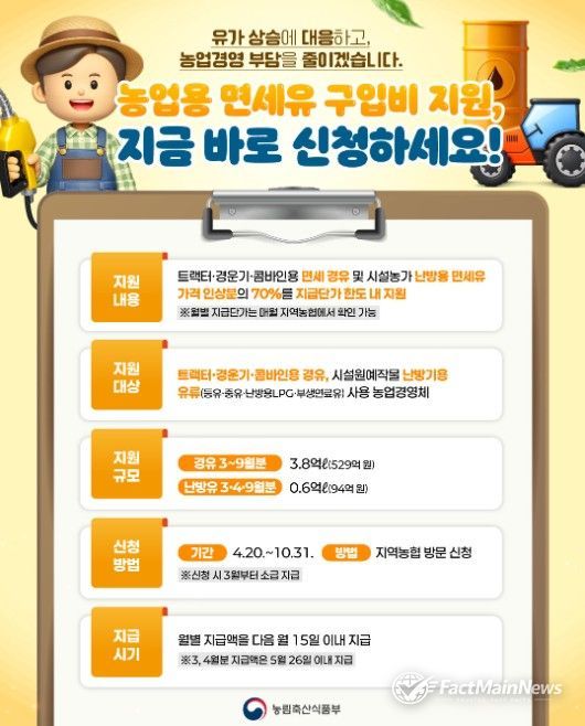팩트메인뉴스 이훈 기자 | 농림축산식품부는 올해 추경예산에 반영된 농기계 3종 면세경유 유가연동보조금과 시설농가 난방용 면세유 유가연동보조금 지원 신청·접수중(4월 20일~10월 31일)에 있다고 밝혔다.