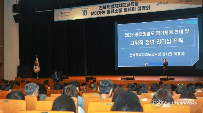 팩트메인뉴스 이훈 기자 | 전북특별자치도교육청은 27일 전주학생교육문화관에서 ‘2026년 행동강령책임관 등 청렴교육’을 실시했다.