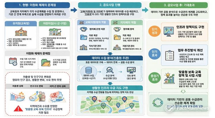 팩트메인뉴스 이훈 기자 | 교육부와 한국보육진흥원(원장 조용남)은 모든 영유아가 집 근처에서 질 높은 교육·보육 서비스를 받을 수 있도록 유치원과 어린이집 수급 정보를 한 곳에서 분석·제공하는 ‘영유아 교육·보육 인프라 데이터 체계 구축 시범지역 공모’를 실시한다.
