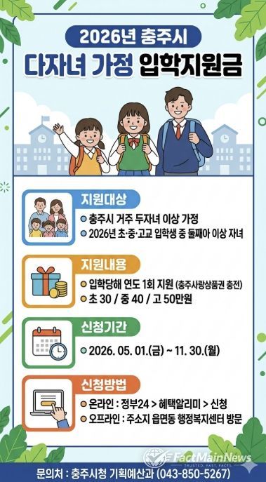 팩트메인뉴스 이훈 기자 | 충주시는 다자녀 가정의 경제적 부담을 완화하고 안정적인 양육 환경을 조성하기 위해 2026학년도 초·중·고등학교에 입학하는 둘째 자녀 이상에게 입학지원금을 지원한다고 밝혔다.