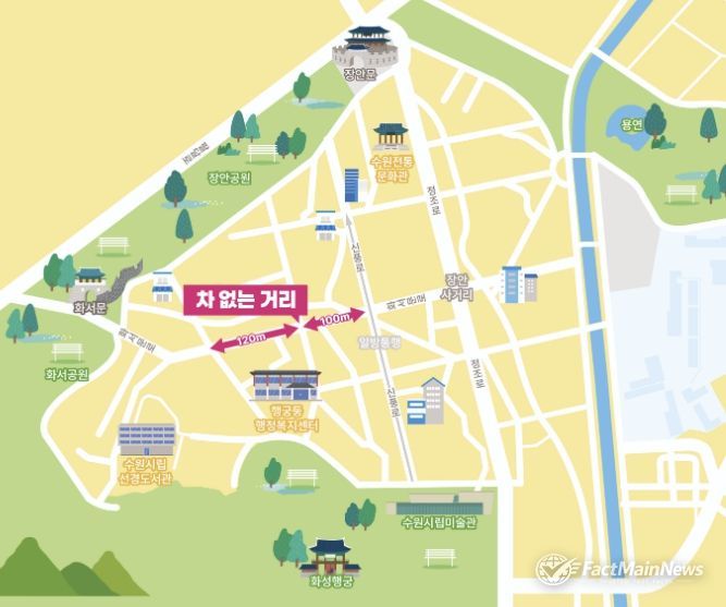 팩트메인뉴스 이훈 기자 | 수원시 행궁동 화서문로 34번지부터 신풍로 47번지까지 약 220m 구간이 5월부터 매주 토요일 ‘차 없는 거리’로 운영된다.