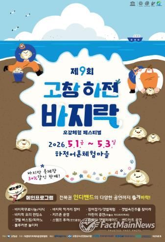팩트메인뉴스 이훈 기자 | 고창군이 오는 5월1~3일 심원면 하전어촌체험마을 일원에서 ‘제9회 하전바지락 오감체험 페스티벌’을 개최한다고 밝혔다.