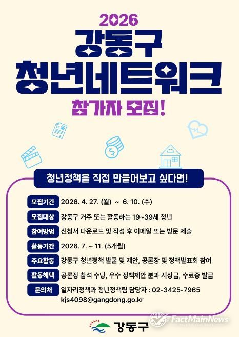 팩트메인뉴스 이훈 기자 | 서울 강동구는 ‘2026년 강동구 청년네트워크’ 참여자를 모집한다고 밝혔다. 청년네트워크는 청년들이 직접 의제를 발굴하고 정책을 제안하는 사업이다.