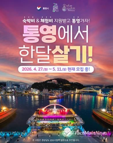 팩트메인뉴스 이훈 기자 | 통영시는 체류형 관광 활성화와 지역 경제 활성화를 위해 ‘통영애(愛)온나(2026년 경남에서 한 달 여행하기)’사업 1차 참가자를 오는 5월 11일까지 모집한다.