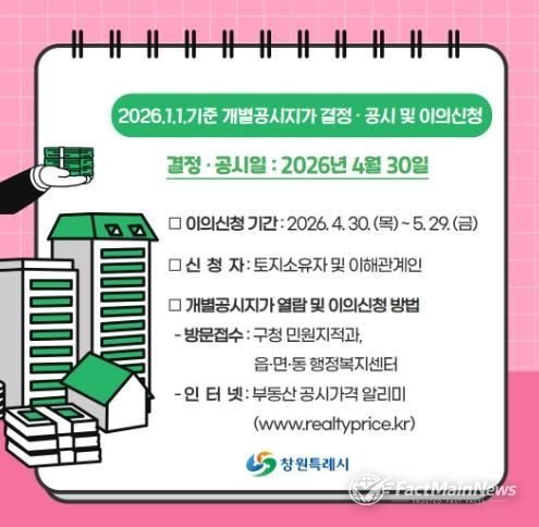 팩트메인뉴스 이훈 기자 | 창원특례시는 2026년 1월 1일 기준 개별공시지가 36만 5933필지를 4월 30일 결정·공시하고, 오는 5월 29일까지 이의신청을 접수한다고 밝혔다.