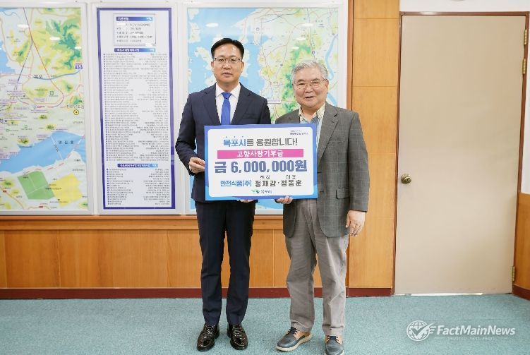 팩트메인뉴스 이훈 기자 | 목포시는 지난 27일 만전식품 정재강 회장이 시를 방문해 고향사랑기부금 600만 원을 기탁했다고 밝혔다.