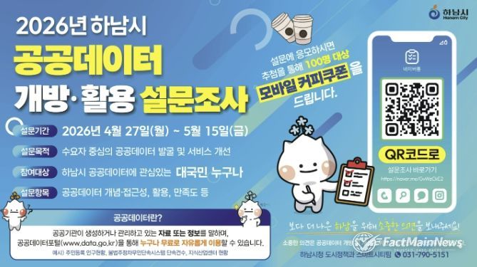 팩트메인뉴스 이훈 기자 | 하남시는 시민과 기업, 연구기관 등 다양한 수요자의 의견을 반영해 공공데이터 개방 및 활용을 확대하고자 ‘2026년 하남시 공공데이터 설문조사’를 실시한다고 밝혔다.