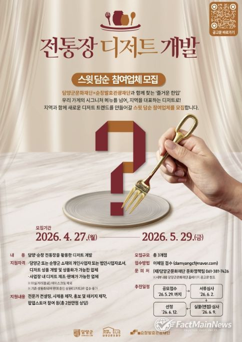 팩트메인뉴스 이훈 기자 | 담양군문화재단이 순창발효관광재단과 함께 지역 전통장을 활용한 디저트 개발 프로젝트 ‘스윗 담순’ 참여업체를 모집한다.