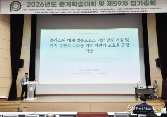 4월 23~24일 강원대학교에서 열린 ‘KTAPPI 2026 춘계학술대회 및 제59회 정기총회’는 산·학·연 전문가와 회원들이 대거 참여하여 펄프·제지 산업의 미래 전략을 모색하는 자리로 마련됐다.