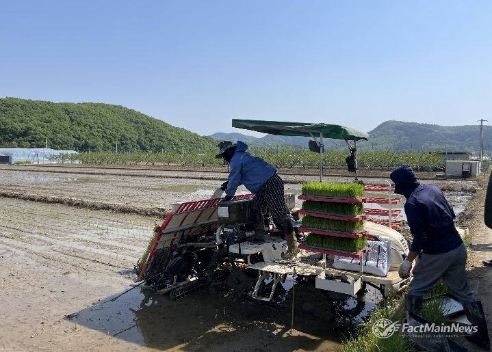 팩트메인뉴스 이훈 기자 | 경산시 자인면 울옥리 신호철 농가는 27일 자인면 원당들 일원 6ha에 올해 첫 모내기를 실시했다.