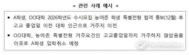 팩트메인뉴스 이훈 기자 | 교육부는 ‘농어촌 학생 특별전형’ 자격요건과 관련하여 대입현장에서 반복적으로 발생하는 불합리한 사례를 해소하기 위한 적극행정조치 및 제도개선을 시행할 계획이라고 밝혔다.
