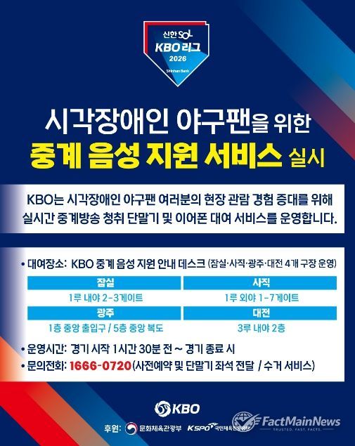 팩트메인뉴스 이훈 기자 | KBO는 2023년부터 잠실, 사직, 광주 구장에서 운영해 온 ‘KBO 리그 시각장애인 현장 관람객 대상 중계 음성 지원 서비스’를 올해 대전 한화생명 볼파크까지 확대해 총 4개 구장에서 운영한다.