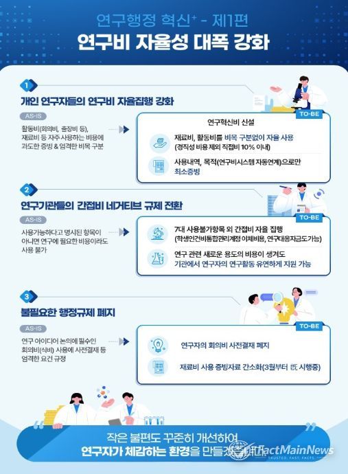 팩트메인뉴스 이훈 기자 | 과학기술정보통신부은 4월 28일 국무회의에서 연구비 자율성 강화를 위한 「국가연구개발혁신법 시행령」 개정안이 의결됐다고 밝혔다.