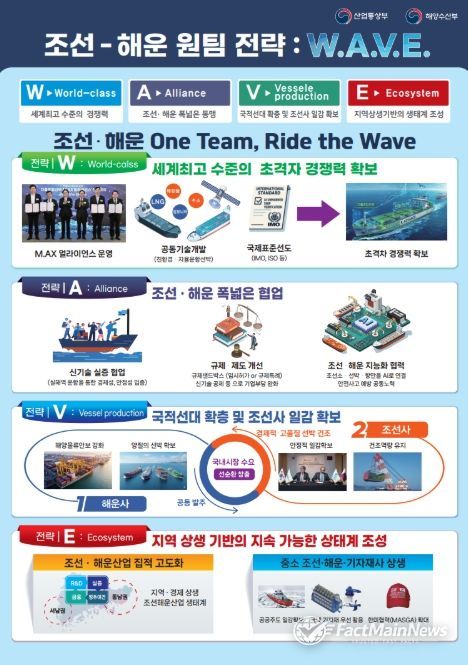 W.A.V.E. 전략은 ❶‘W(World Top Class)’ : 세계 최고 수준의 초격차 기술을 확보하고, ❷‘A(Alliance)’ : 조선・해운 전반에 폭넓은 산업연계 동맹을 구성하고, ❸’V(Vessel production)’ : 국적 선대 확충과 국내조선사 일감 확보로, ❹‘E(Ecosystem)’ : 지역경제 기반의 상생혁신 생태계를 구축한다는 조선-해운 상생발전의 비전을 의미한다.