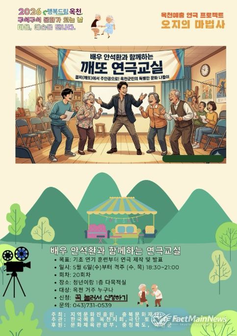 팩트메인뉴스 이훈 기자 | 옥천군은 29일부터 문화가 있는 날 ‘청년이랑’ 1층 다목적실에서 배우 안석환과 함께하는 ‘연극교실’을 본격 운영한다고 밝혔다.
