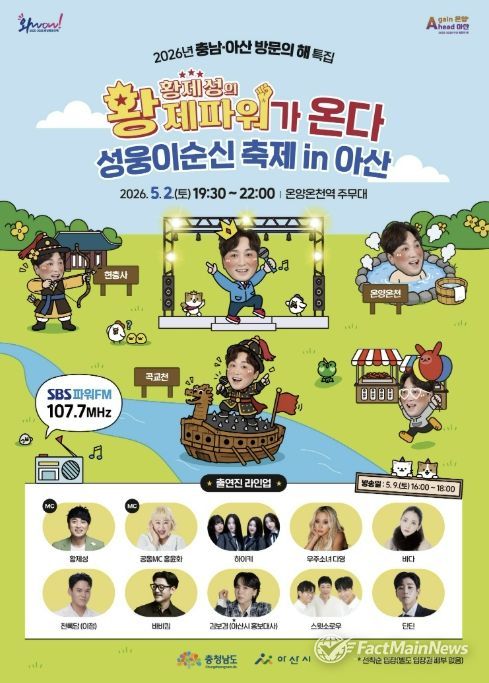 팩트메인뉴스 이훈 기자 | 인기 라디오 프로그램 SBS 파워FM ‘황제성의 황제파워’ 공개방송이 5월 2일 ‘제65회 아산 성웅 이순신축제’ 현장에서 열린다. 아산에서 라디오 공개방송이 열리는 것은 2013년 ‘대한민국 아산 온천대축제’ 이후 13년 만이다.