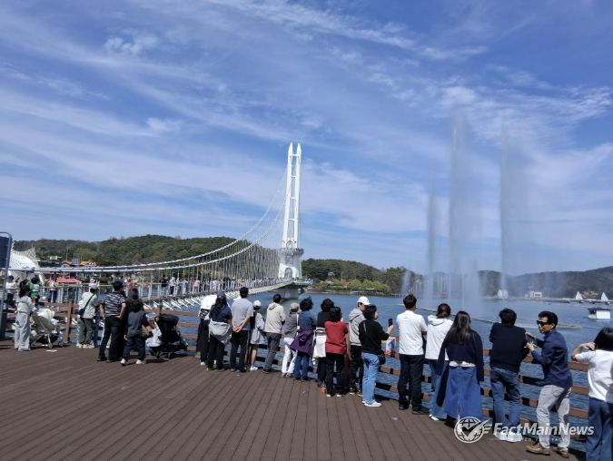예당관광지는 예당호 전경을 한눈에 담을 수 있는 전망대를 비롯해 402m 길이의 출렁다리와 최대 높이 110m 고사분수가 어우러진 음악분수 등 색다른 즐길 거리를 갖췄으며, 탁 트인 호수 풍경과 함께 짜릿한 스릴을 동시에 느낄 수 있어 방문객들의 발길이 이어지고 있다.