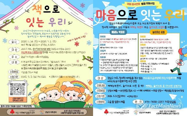 팩트메인뉴스 이훈 기자 | 꿈이 모이는 도시, 미래를 그리는 강남구가 저소득·다문화가정 아동의 건강한 정서 성장을 돕는 ‘책과 마음으로 잇는 우리’ 프로그램 참여자를 5월 3일까지 모집한다.