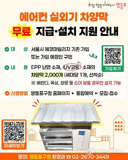 팩트메인뉴스 이훈 기자 | 영등포구가 다가오는 여름철 무더위에 대비해 구민들의 냉방비 부담을 줄이고 에너지 효율을 높이기 위한 ‘에어컨 실외기 차양막 설치 지원사업’을 추진한다고 밝혔다.
