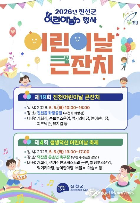 팩트메인뉴스 이훈 기자 | 충북 진천군은 제104회 어린이날을 맞아 5월 5일 진천읍 화랑공원과 덕산읍 유소년축구장 두 곳에서 어린이날 기념행사를 개최한다고 밝혔다.