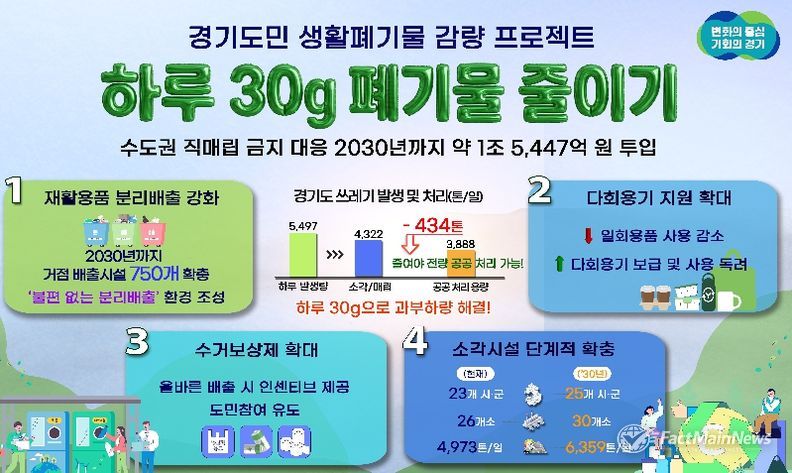 팩트메인뉴스 이훈 기자 | 수도권 직매립 금지에 따른 생활쓰레기 감량을 위해 경기도가 2030년까지 5년간 약 1조 5,447억 원을 투입하는 ‘하루 30g, 도민실천형 생활폐기물 감량 프로젝트’를 추진한다.