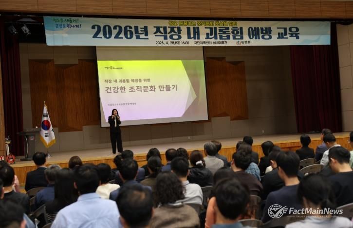 팩트메인뉴스 이훈 기자 | 청도군은 4월 28일 국민체육센터 실내체육관에서 김동기 청도군수 권한대행을 비롯한 간부 공무원과 전 직원이 참석한 가운데 ‘2026년 직장 내 괴롭힘 예방 교육’을 실시했다.