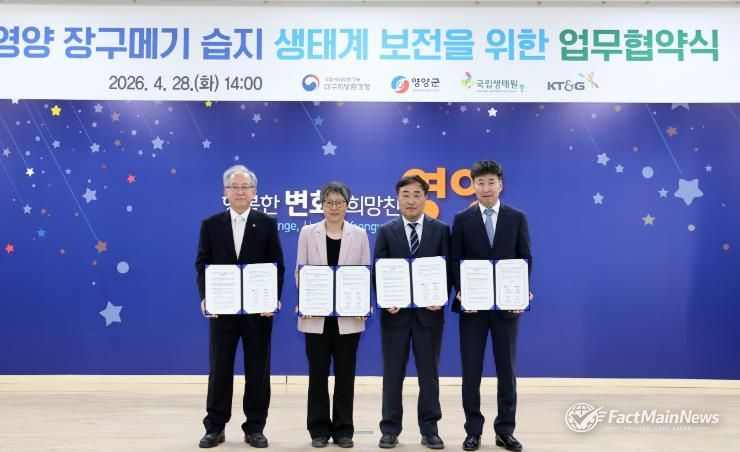 팩트메인뉴스 이훈 기자 | 영양군은 대구지방환경청, 국립생태원, ㈜KT&G와 4월 28일, 영양 장구메기 습지 생태계 보전을 위한 업무협약을 체결했다.