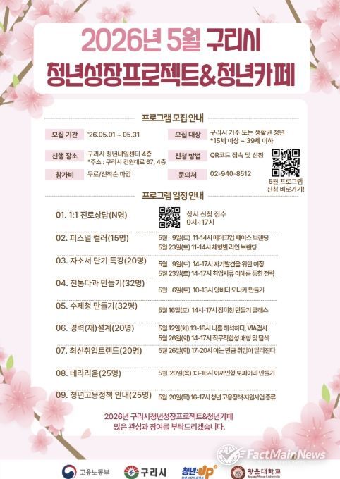 팩트메인뉴스 이훈 기자 | 구리시는 2026년 5월 한 달간 구리시 청년내일센터에서 운영되는 '청년성장프로젝트' 참여자를 모집한다고 밝혔다.