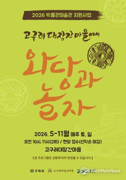 팩트메인뉴스 이훈 기자 | 구리시는 오는 5월 2일부터 11월 1일까지 매주 주말 고구려대장간마을에서 2026년 경기도 박물관·미술관 지원사업의 하나로 ‘고구려대장간마을에서 와당과 놀자’ 체험 행사를 운영한다고 밝혔다.