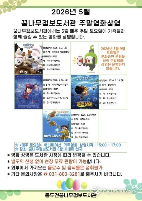 팩트메인뉴스 이훈 기자 | 동두천시 도서문화사업소 정보도서관에서는 오는 5월 매주 토요일 어린이와 가족을 위한 애니매이션 및 가족영화 4편을 상영한다고 밝혔다.