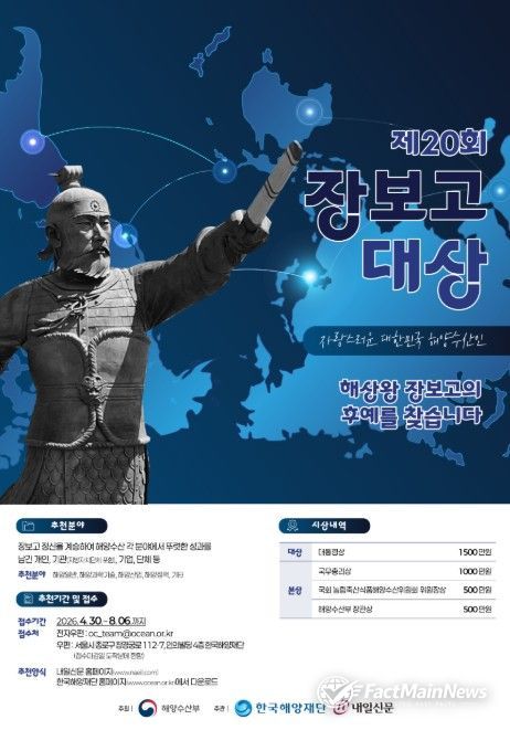 팩트메인뉴스 이훈 기자 | 해양수산부는 4월 30일부터 8월 6일까지 ‘제20회 장보고대상’ 후보자를 공모한다고 밝혔다.