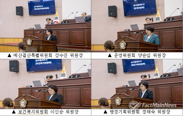 본회의에 앞서, 예산결산특별위원회 강수진 위원장, 운영위원회 양순임 위원장, 보건복지위원회 이인순 위원장, 행정기획위원회 정해숙 위원장이 위원회별 심사 결과를 보고했다.