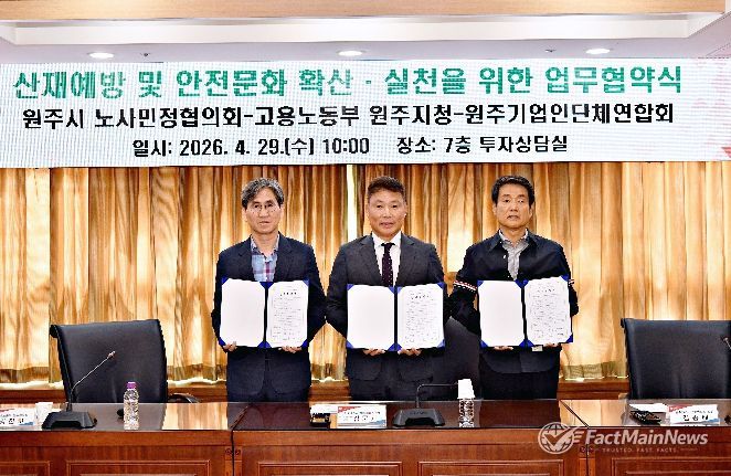 이번 협약은 지역 노사민정 상생협력 사업의 일환인 ‘2026년 찾아가는 小사업장 산재예방 교육’ 추진을 위한 기관 간 업무협약이다. 협약에는 원주시 노사민정협의회와 고용노동부 원주지청, 원주기업인단체연합회가 참여해 안전 문화 확산을 위한 적극적인 지원과 협조를 약속했다.