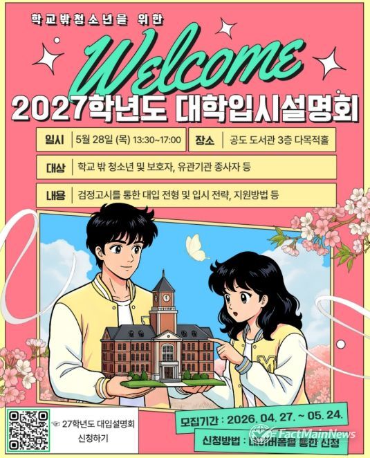 팩트메인뉴스 이훈 기자 | 안성시학교밖청소년지원센터는 학교 밖 청소년의 성공적인 진학을 돕기 위해 오는 5월 28일 오후 1시 30분부터 공도 도서관 다목적홀에서 ‘2027학년도 대학 입시 설명회’를 개최한다고 밝혔다.