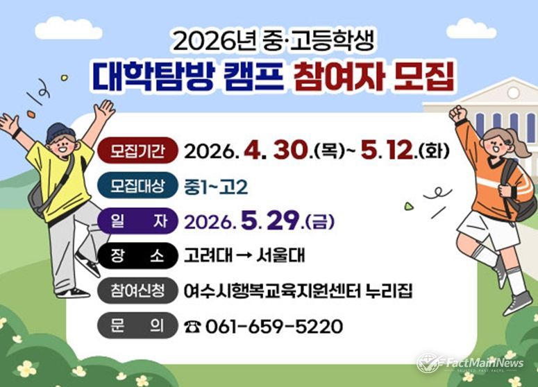 팩트메인뉴스 이훈 기자 | 여수시는 오는 30일부터 관내 중학교 1학년부터 고등학교 2학년 학생들을 대상으로 ‘2026년 중·고등학생 대학 탐방 캠프’ 참여자를 모집한다.