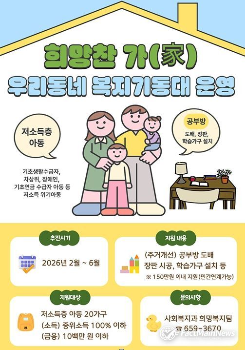 팩트메인뉴스 이훈 기자 | 여수시는 저소득층 아동의 학습 여건 개선과 안전한 주거공간 조성을 위해 2026년 주거환경 개선사업 ‘희망찬 가(家)’를 추진한다고 밝혔다.