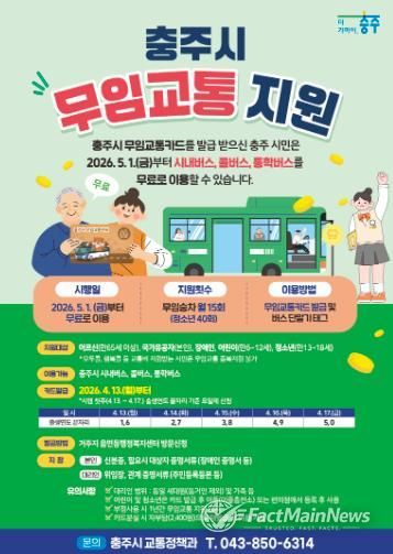 팩트메인뉴스 이훈 기자 | 충주시가 교통약자의 이동 편의를 높이고 사회활동 참여를 독려하기 위해 오는 5월 1일부터 ‘충주시 어르신 등 무임교통 지원 사업’을 전격 시행한다고 밝혔다.