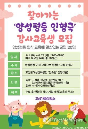팩트메인뉴스 이훈 기자 | 고성가족상담소는 지역사회 내 성평등 문화 확산과 폭력 예방을 위한 ‘찾아가는 양성평등 인형극 강사 교육생’을 모집한다.