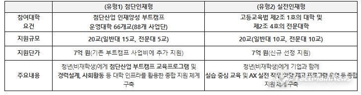 지원 대상은 준비중 청년 등 19세 이상 34세 이하의 비재학생 청년이다. 이번 사업은 청년의 다양한 역량 수요와 진로 수요를 반영하여 ‘첨단인재형’과 ‘실전인재형’의 두 가지 유형으로 운영된다. 첨단인재형은 기존 첨단산업 인재양성 부트캠프 운영 기반을 활용하여 첨단분야 중심의 교육과 취업 지원을 제공하는 유형이며, 실전인재형은 인문·사회·예술·서비스 등 다양한 분야에서 기업과 함께 직무 중심의 인공지능 전환(AX, AI Transformation) 교육과정을 운영하는 유형이다.