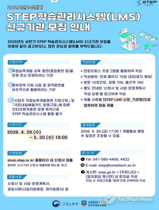 팩트메인뉴스 이훈 기자 | 한국기술교육대학교 온라인평생교육원(원장 한연희)은 고용노동부와 함께 2026년도 상반기 스텝(STEP) 학습관리시스템(LMS, Learning Management System)을 활용할 참여기관을 모집한다.
