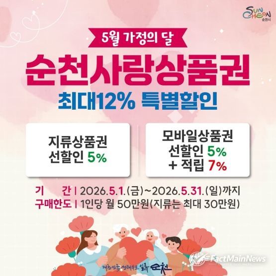 팩트메인뉴스 이훈 기자 | 순천시가 5월 한 달간 순천사랑상품권 특별 할인행사를 추진해 시민들의 가계 부담을 덜고 지역 소상공인에게 활력을 불어넣는 소비 촉진에 나선다.